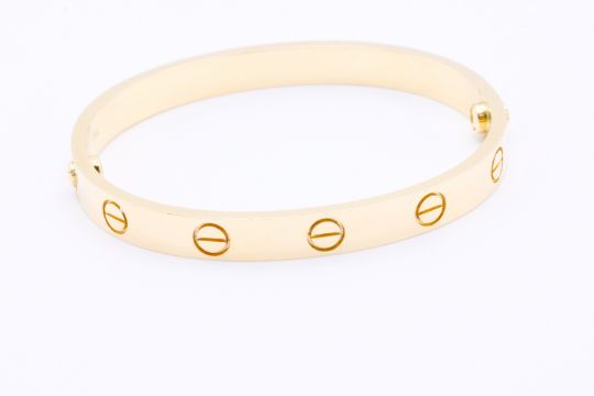 This bracelet, 18kt Yellow gold 750. Comes with a screwdriver. Width: 6.1 mm. this style was designed in New York in 1969, this bracelet is an icon of jewellery design: a close fitting, oval bracelet composed of two rigid arcs which is worn on the wrist and removed using a specific screwdriver. The closure is designed with two functional screws placed on either side of the bracelet: you will need help to open or close it. To determine the size of your bracelet, measure your wrist, adding one centimetre to your size for a tighter fit, or two centimetres for a looser fit.